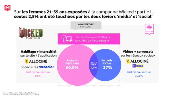Parmi les femmes 21-39 ans touchées par la campagne pour le film Wicked : partie II, 63% ont vu les contenus publicitaires sur le site ou l’application AlloCiné (interstitiels, habillages) ou, en mineur, en vidéo sur le réseau Webedia, quand 39,5% ont vu le brand content produit pour Universal Pictures sur les réseaux sociaux.